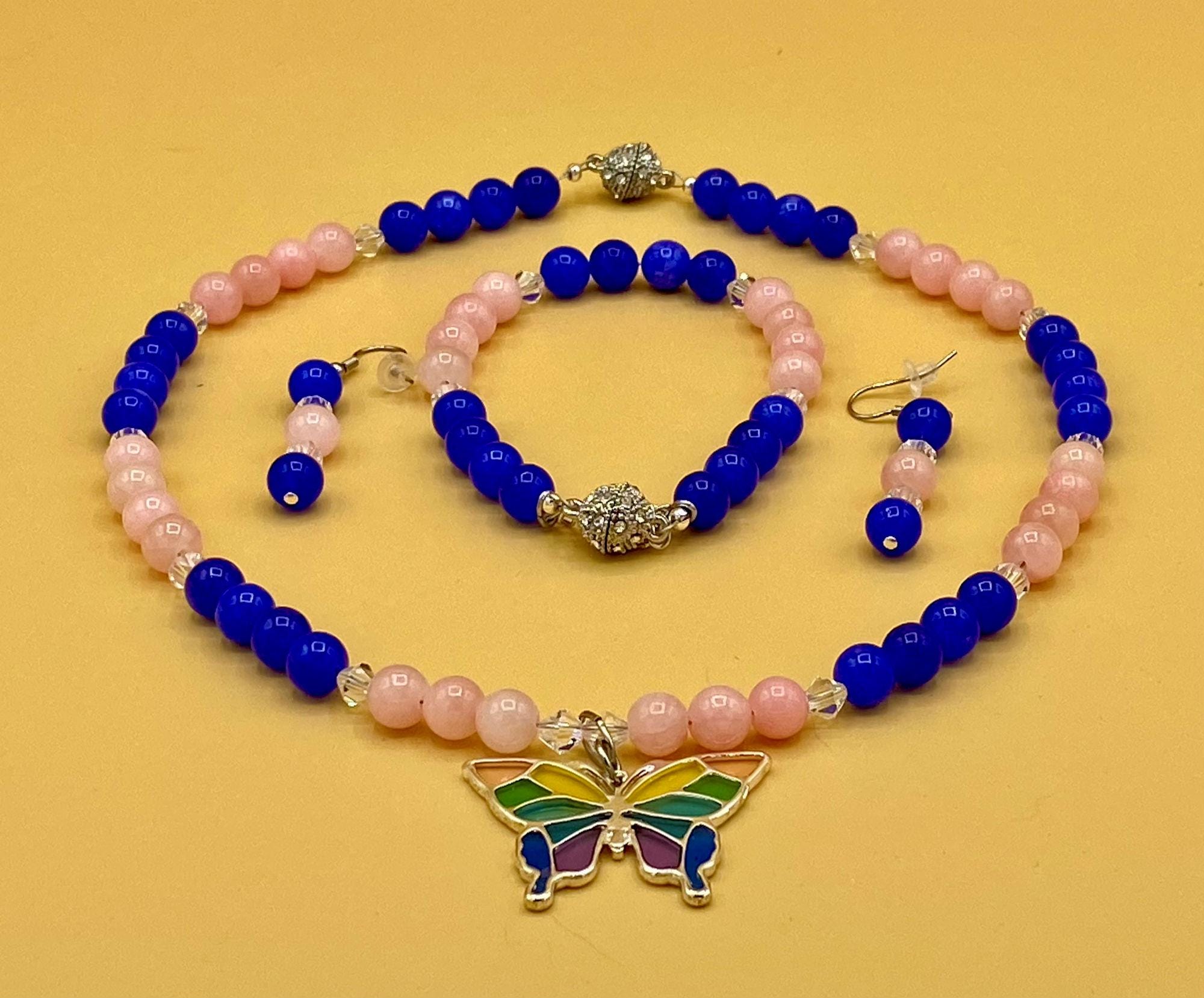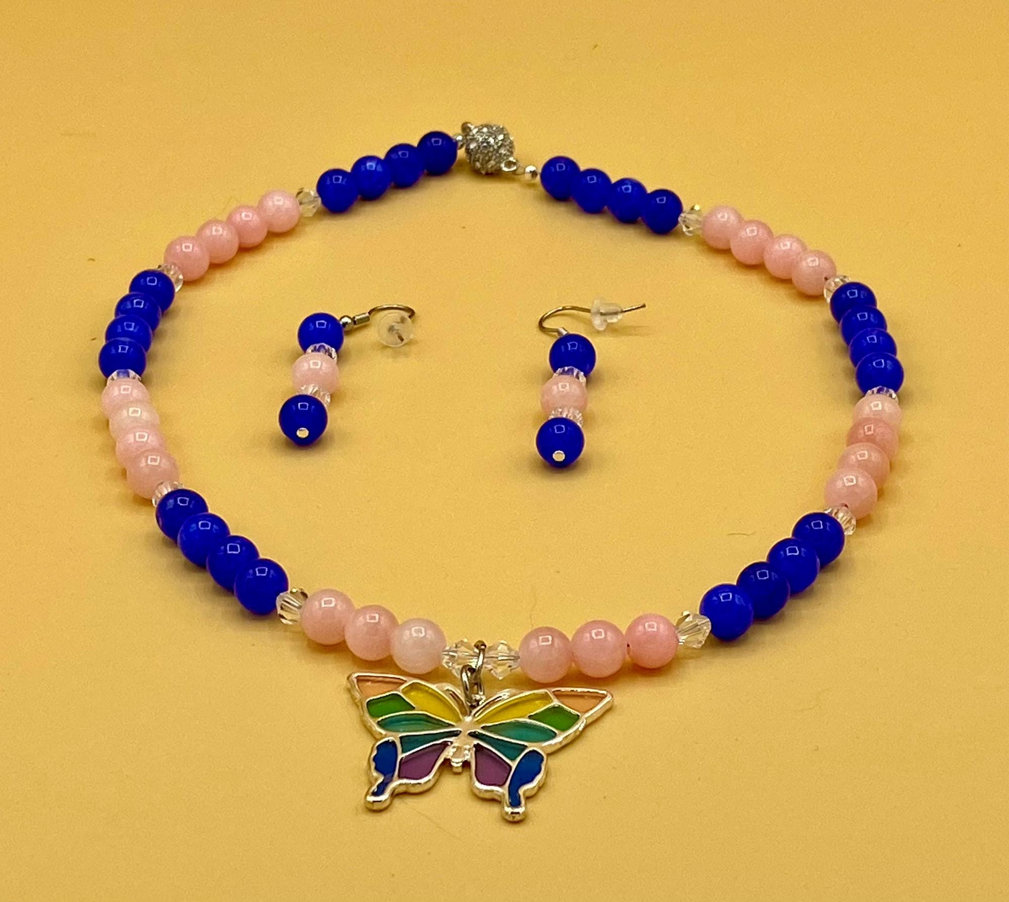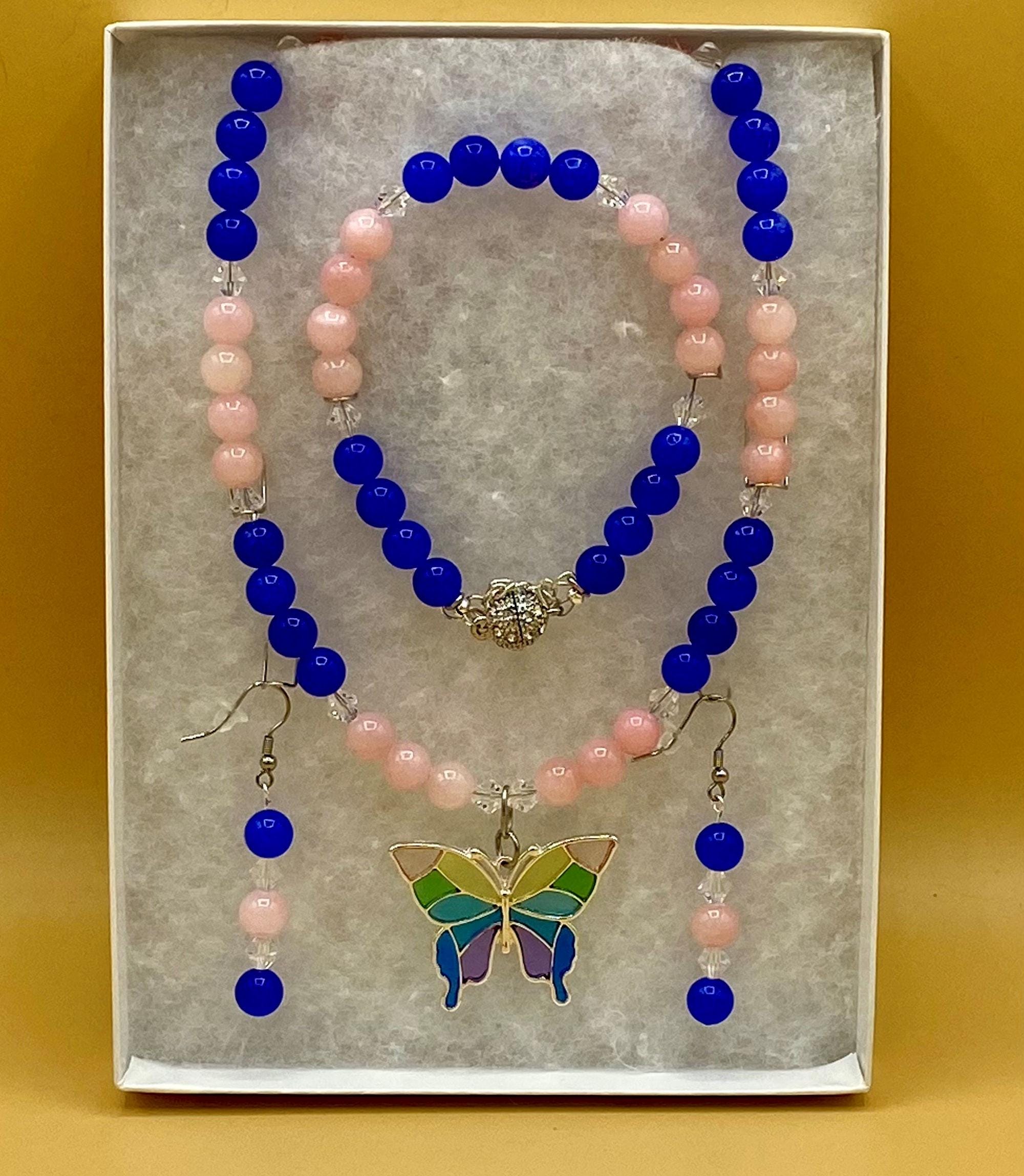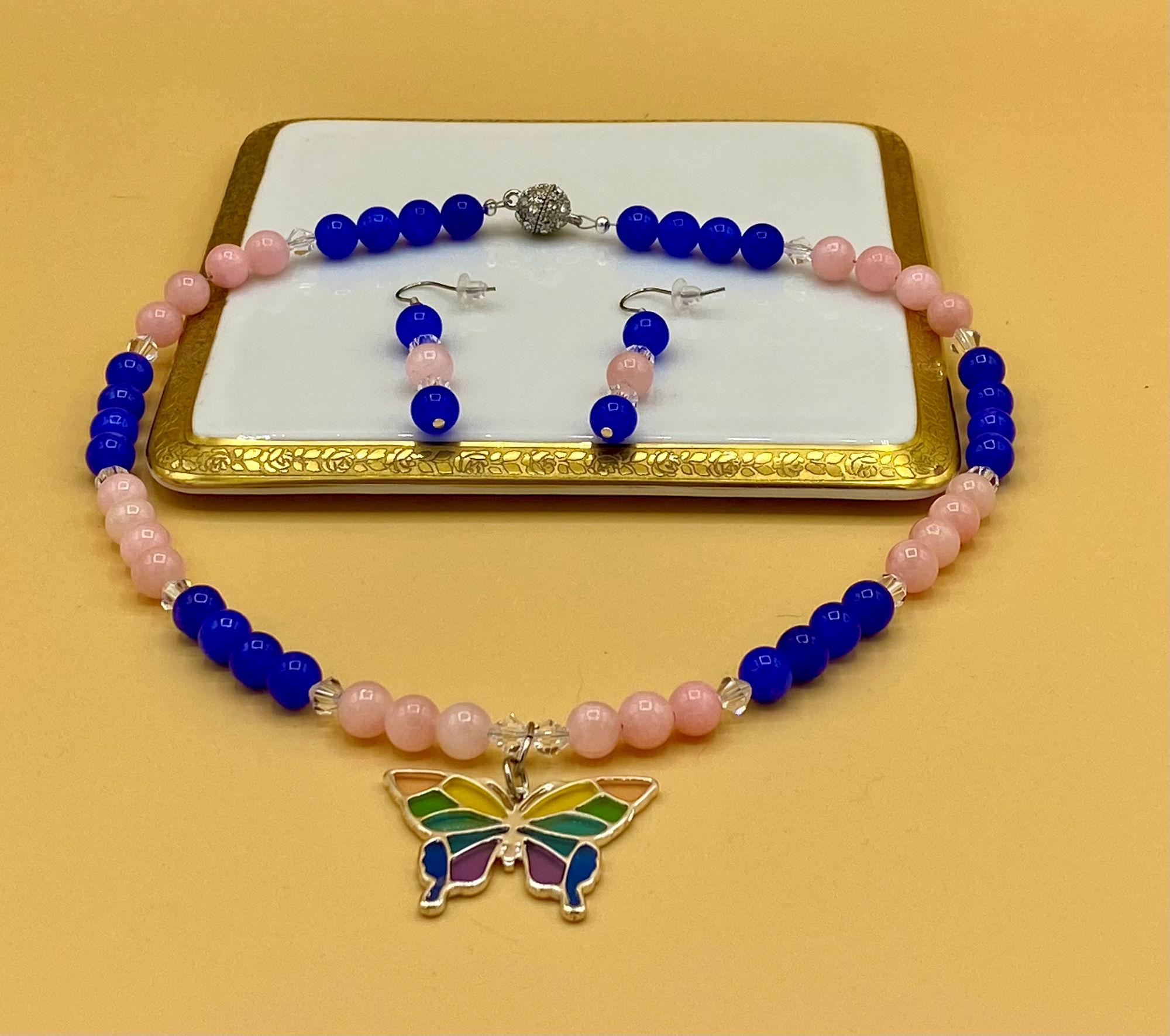 Colorful stain glass look butterfly necklace & earring set with magnetic clasp. Matching bracelet included with easy to use magnetic clasp with a safety chain to prevent loss. Each piece has a custom length to fit all sizes. Necklace is made from pink and blue jade and crystals to form a unique and stylish look. I can convert any of the earrings from pierced to clip on style at no charge, please request this in notes with purchase. Please do not hesitate to contact me with any questions, I would love to hear from you.