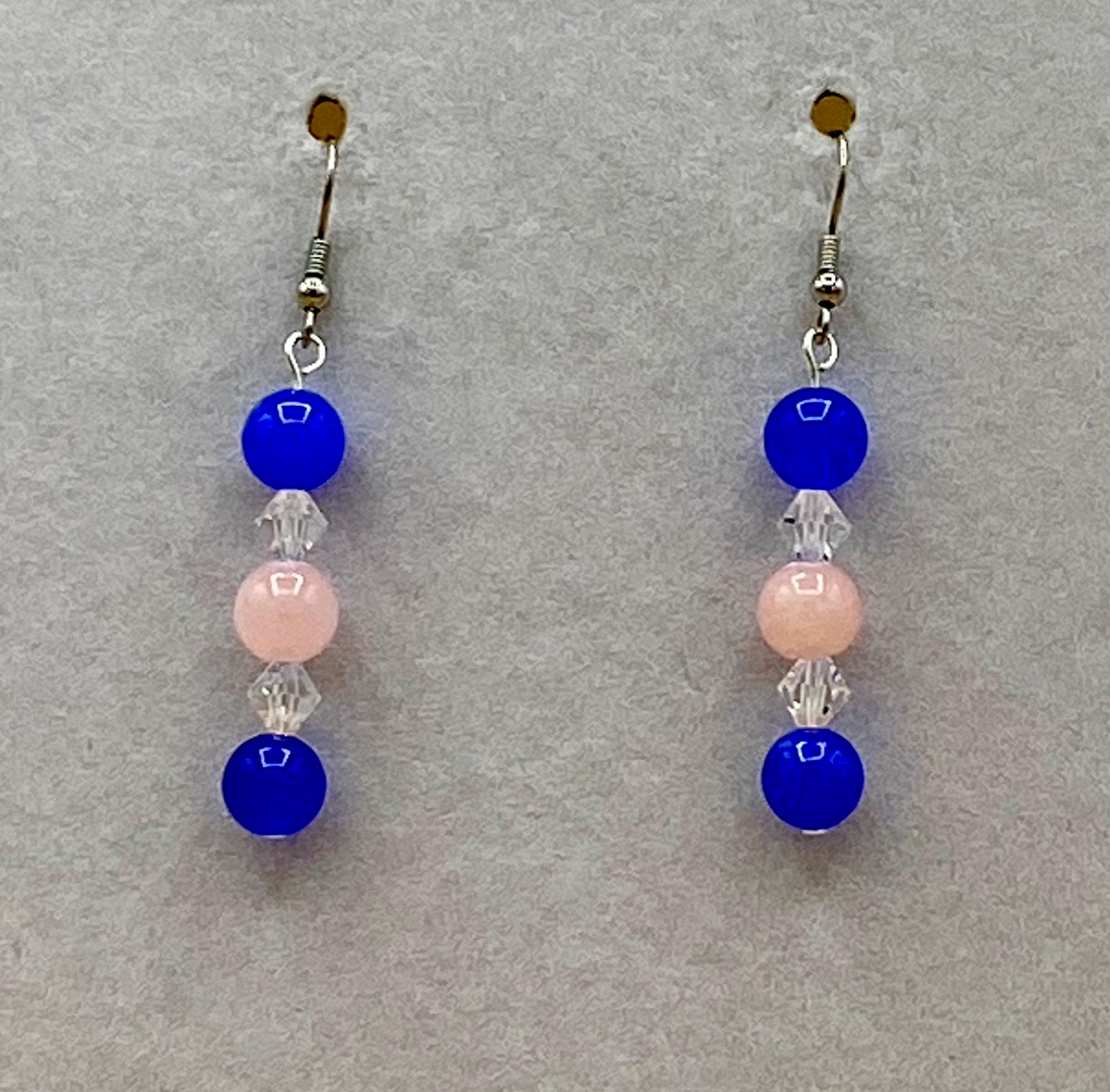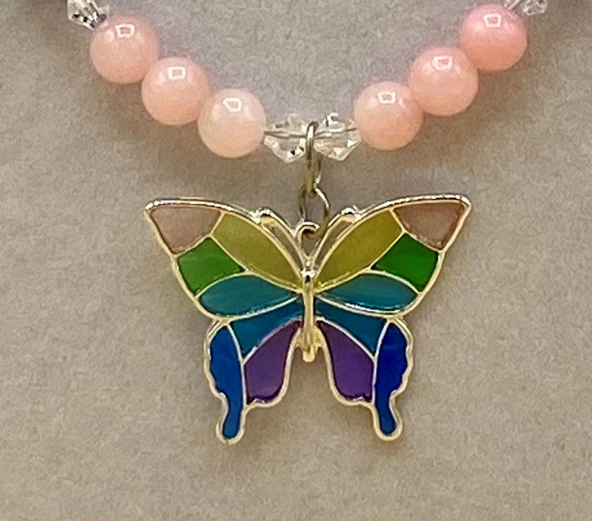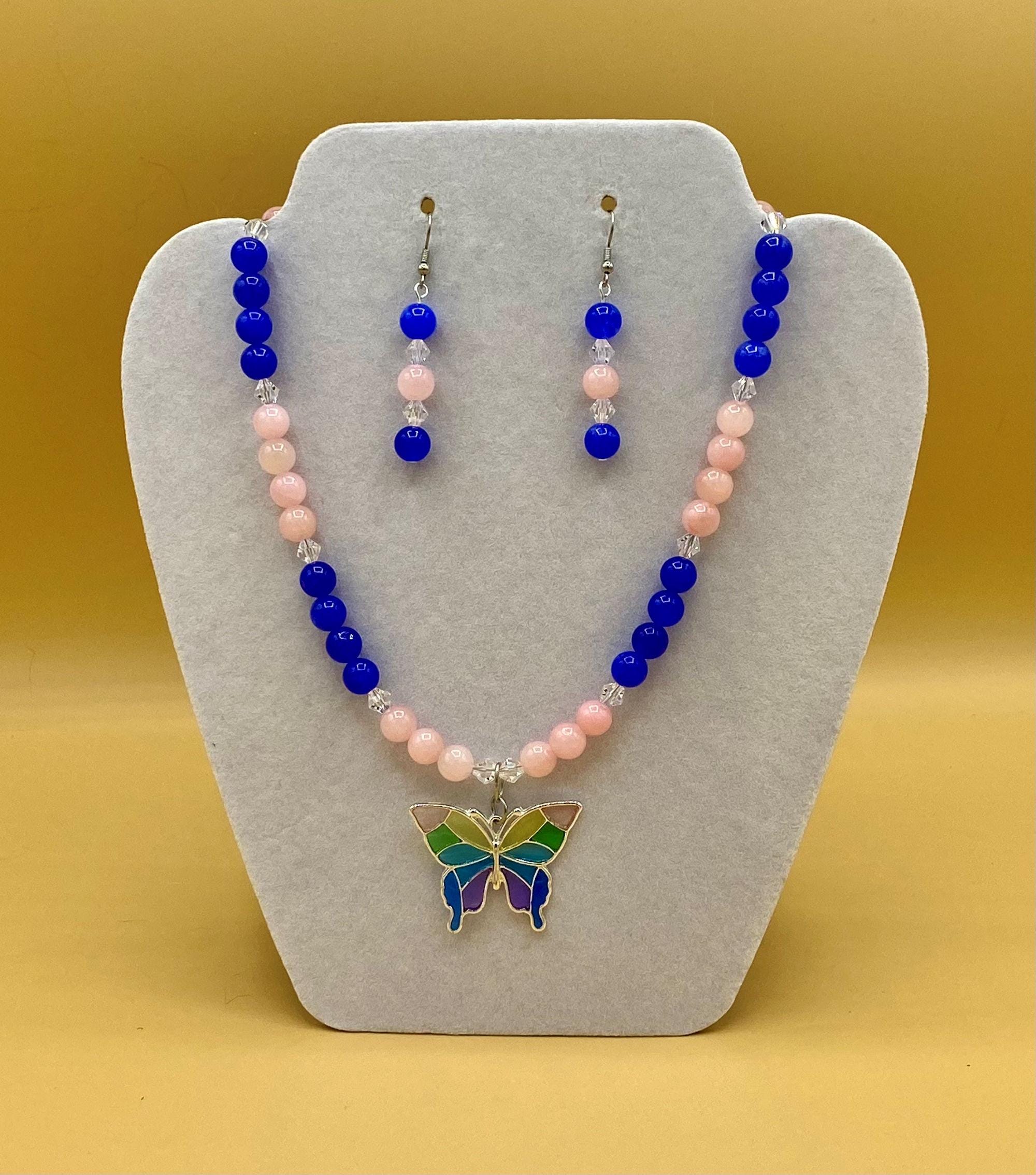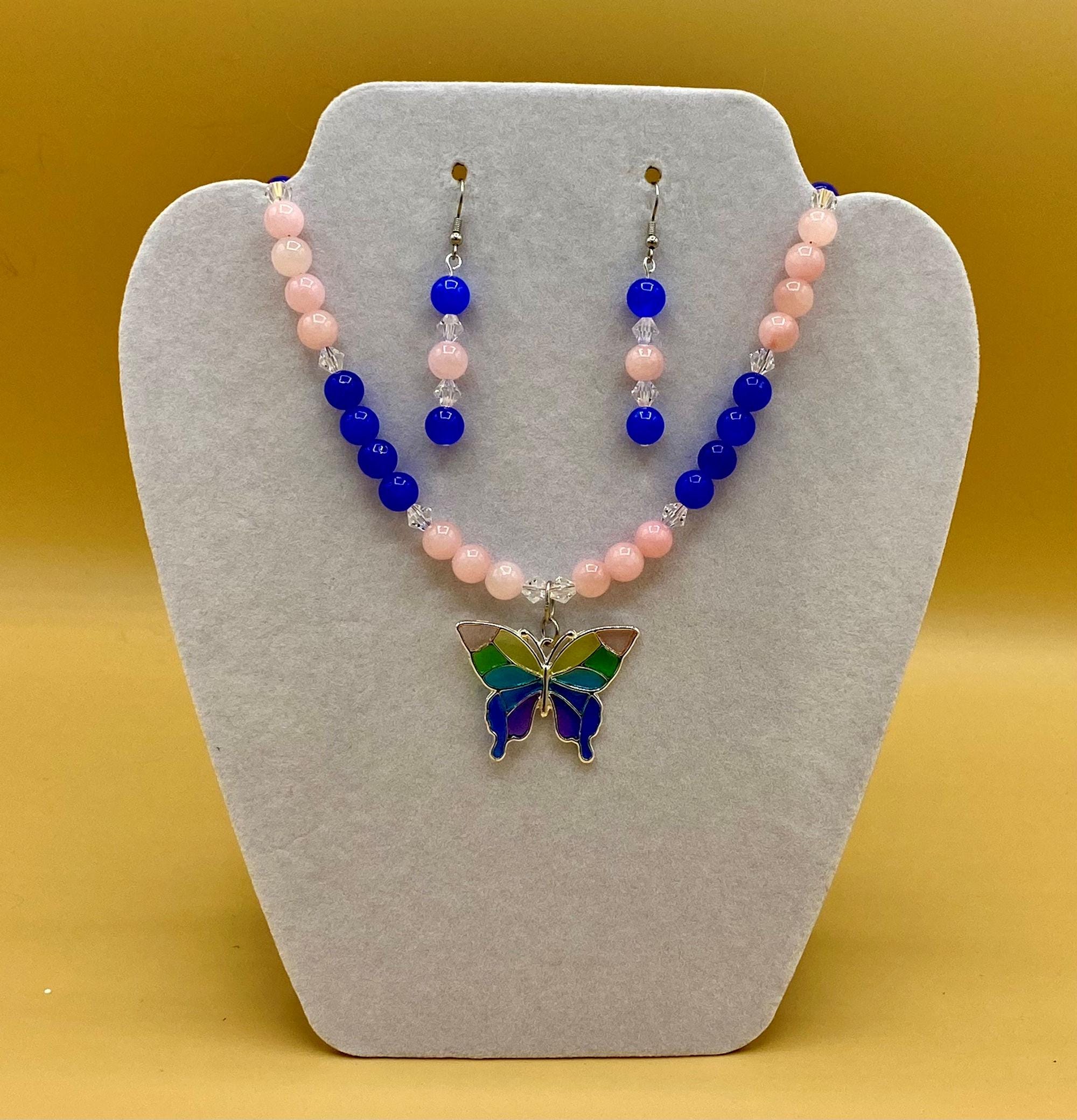 Colorful stain glass look butterfly necklace & earring set with magnetic clasp. Matching bracelet included with easy to use magnetic clasp with a safety chain to prevent loss. Each piece has a custom length to fit all sizes. Necklace is made from pink and blue jade and crystals to form a unique and stylish look. I can convert any of the earrings from pierced to clip on style at no charge, please request this in notes with purchase. Please do not hesitate to contact me with any questions, I would love to hear from you.