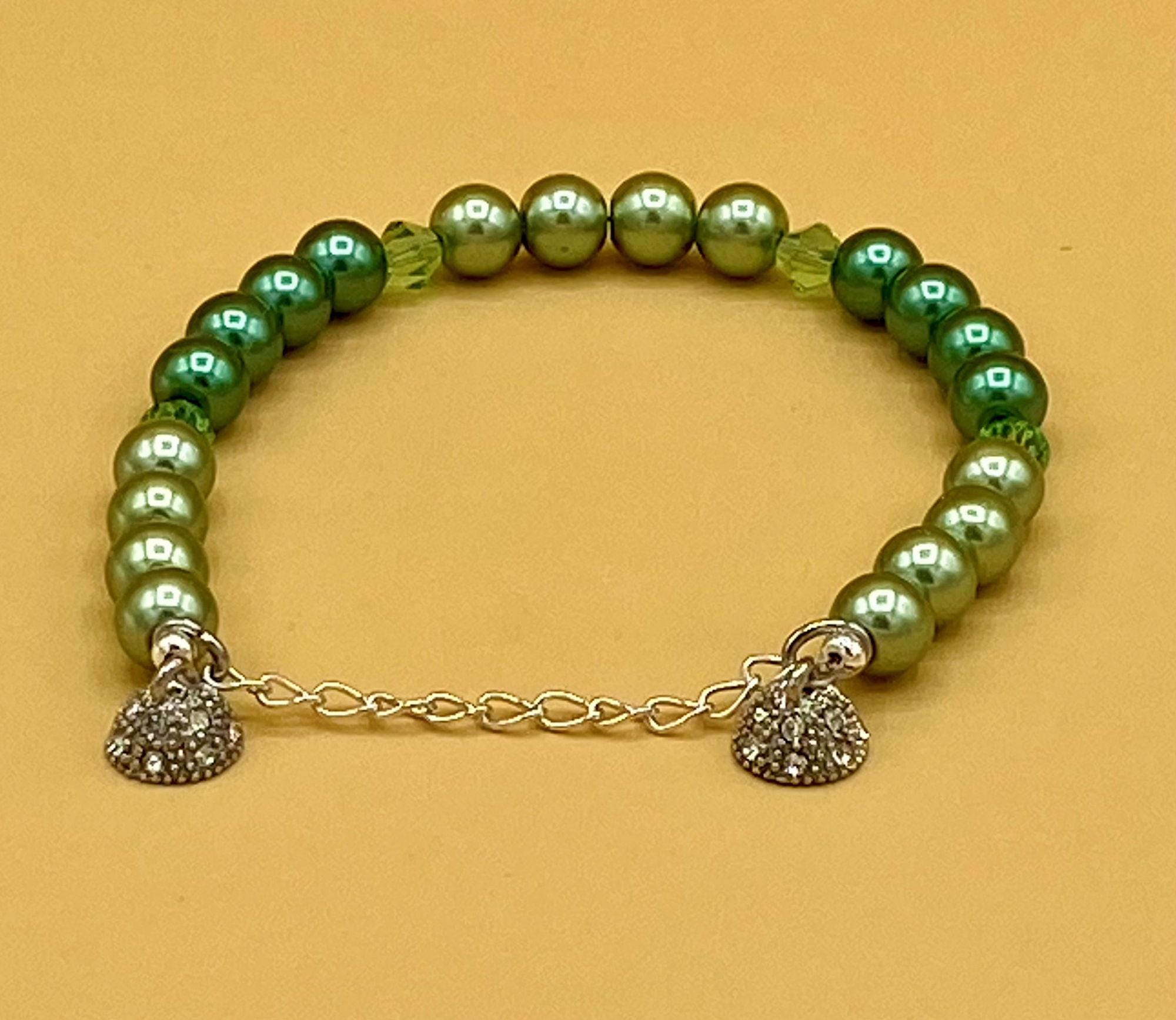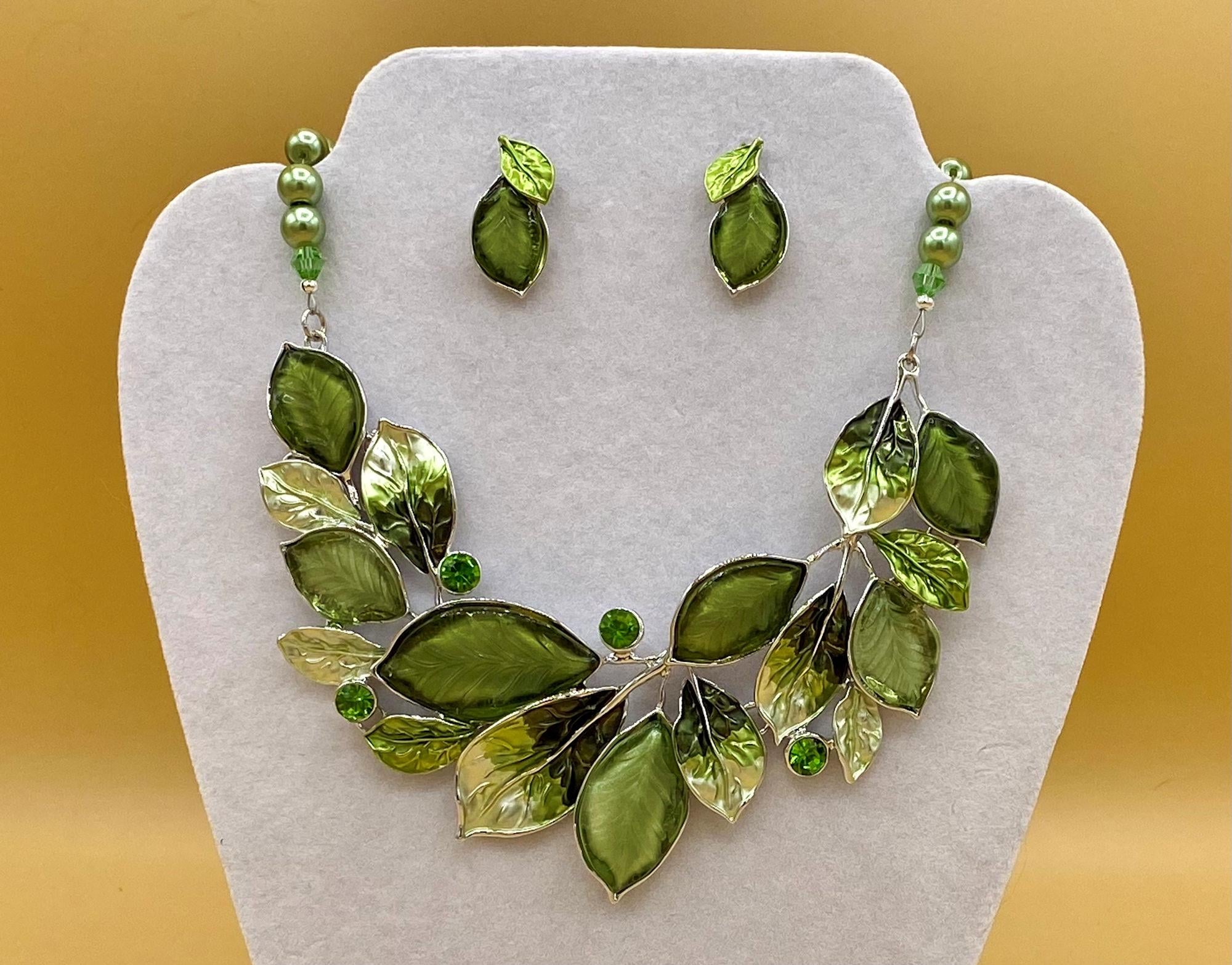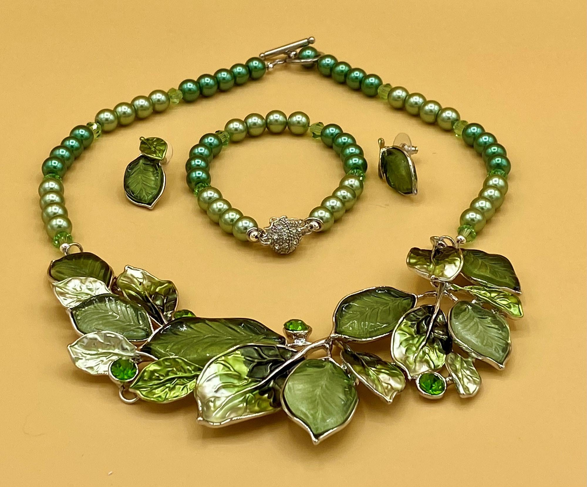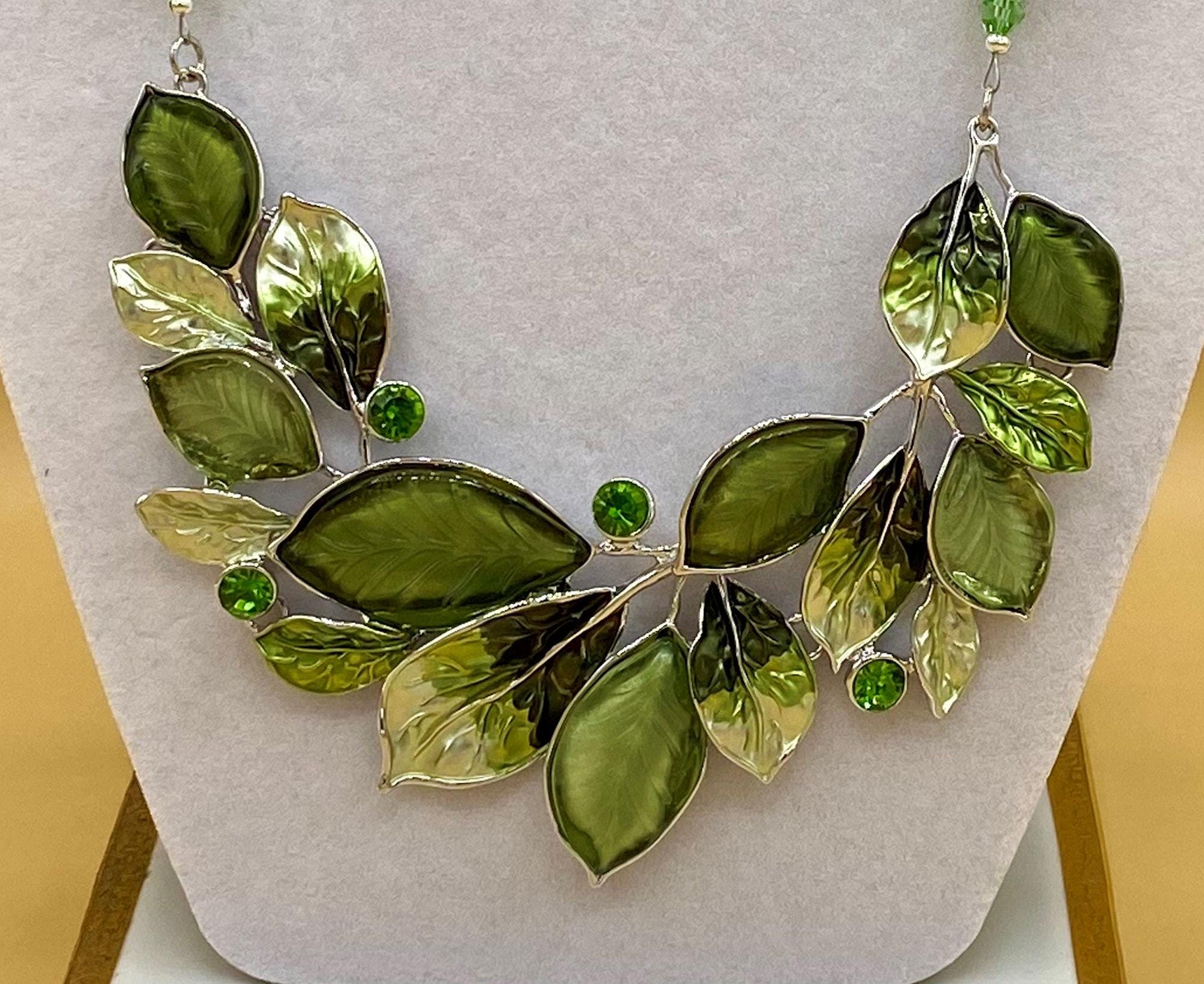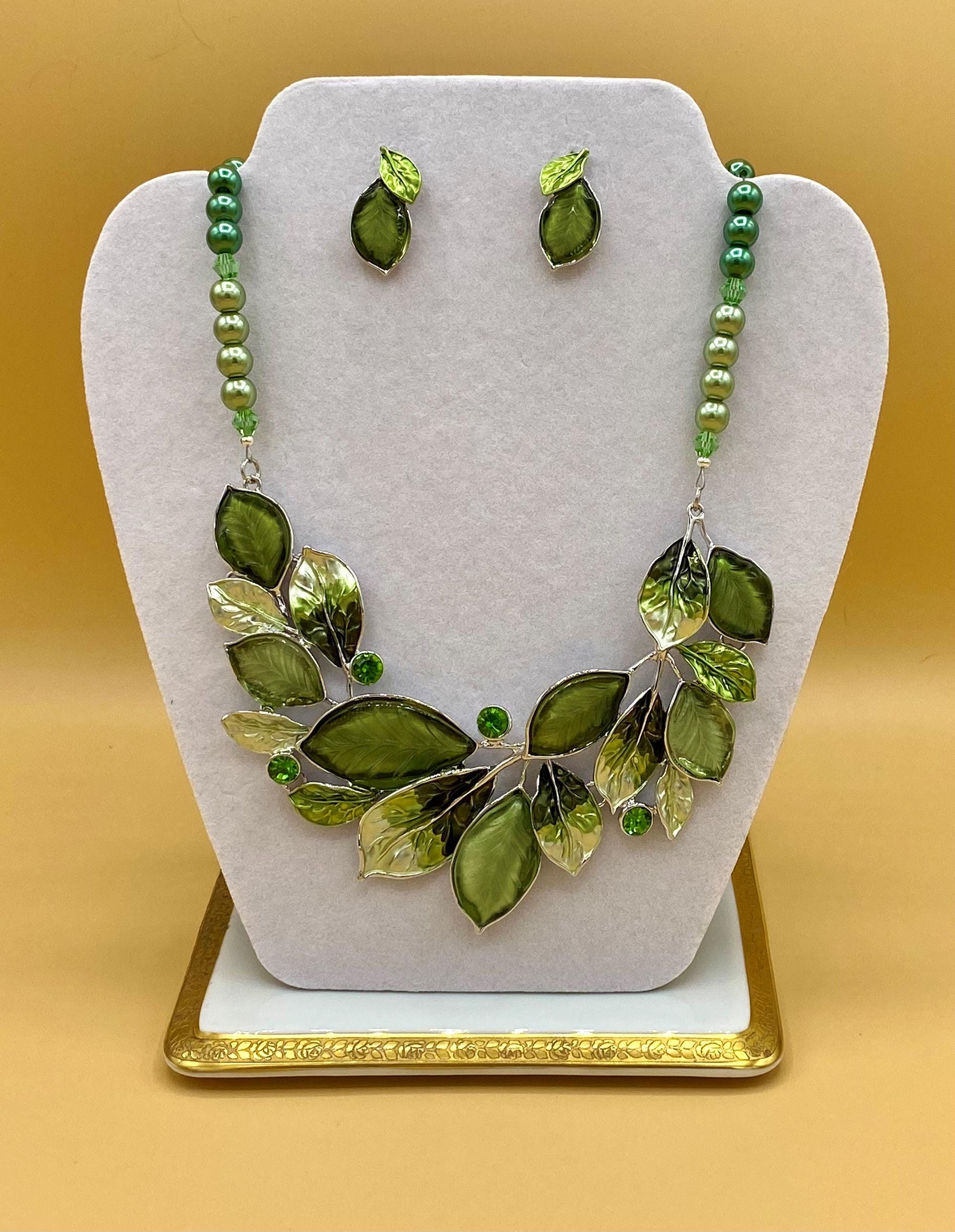 Bright bib necklace and earring set in green tones featuring glass and enamel leaves. This is a lovely modern design light weight necklace style sure to match many wardrobe pieces. Matching bracelet available with easy to use magnetic clasp and a safety chain to prevent loss. This is the set to match many pieces in your wardrobe. Each piece has a custom length to fit all sizes. Necklace is made from glass pearls and crystals to form a unique and stylish look. I can convert any of the earrings from pierced to clip on style at no charge, please request this in notes with purchase. Please do not hesitate to contact me with any questions, I would love to hear from you.