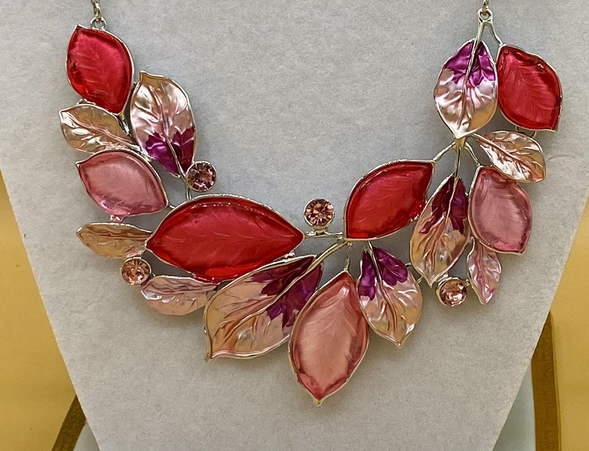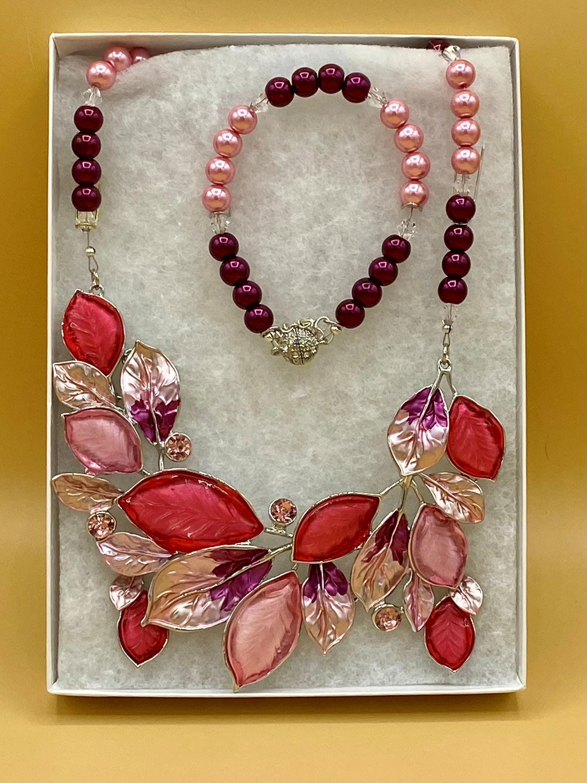 Bright bib necklace and earring set in pink tones featuring glass and enamel leaves. This is a lovely modern design light weight necklace style sure to match many wardrobe pieces. Matching bracelet available with easy to use magnetic clasp and a safety chain to prevent loss. This is the set to match many pieces in your wardrobe. Each piece has a custom length to fit all sizes. Necklace is made from glass pearls and crystals to form a unique and stylish look. I can convert any of the earrings from pierced to clip on style at no charge, please request this in notes with purchase. Please do not hesitate to contact me with any questions, I would love to hear from you.