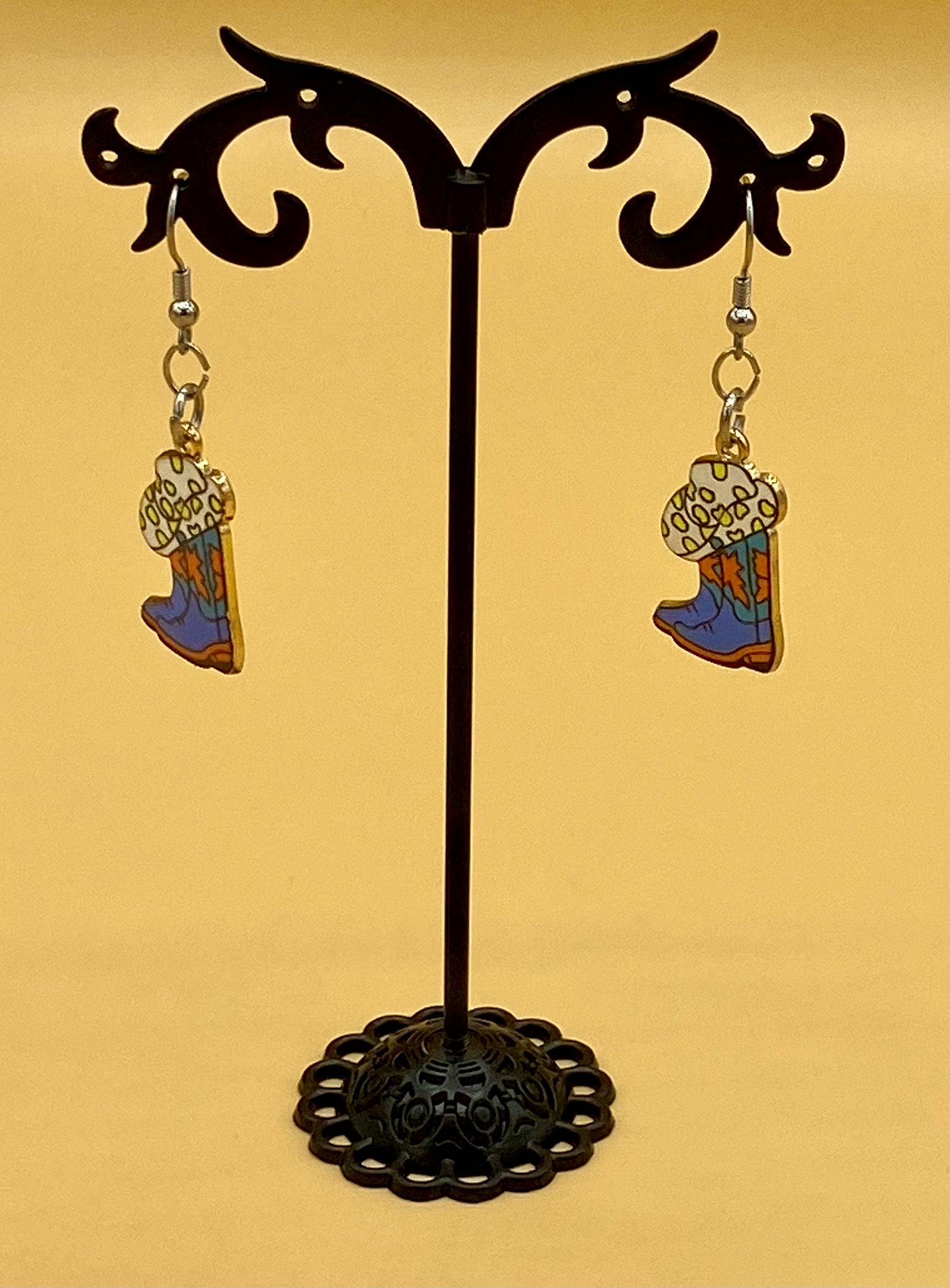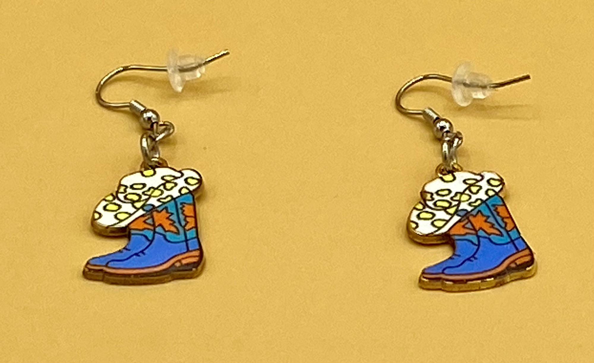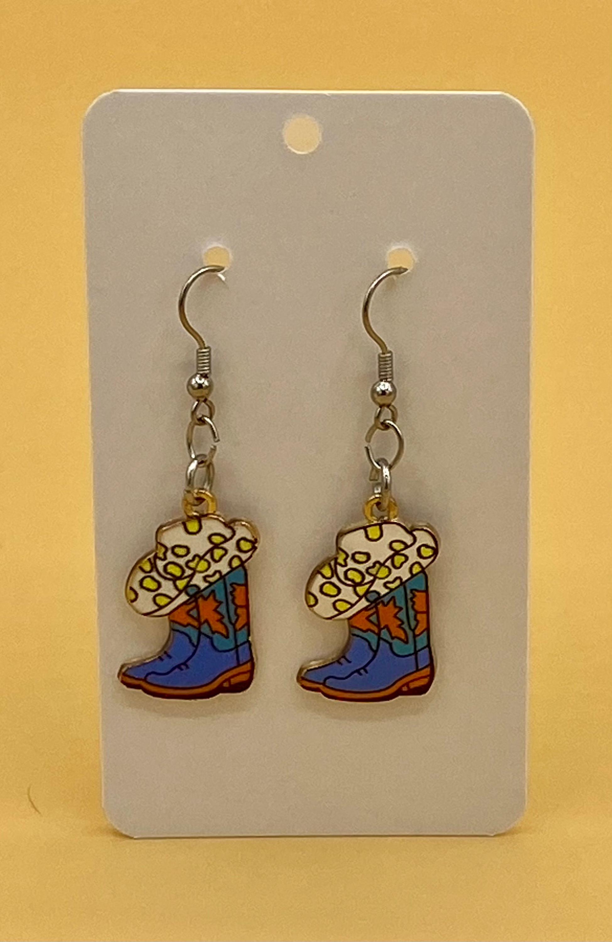 Blue and Orange Cowboy Hat & Boots Earrings Stainless Hook