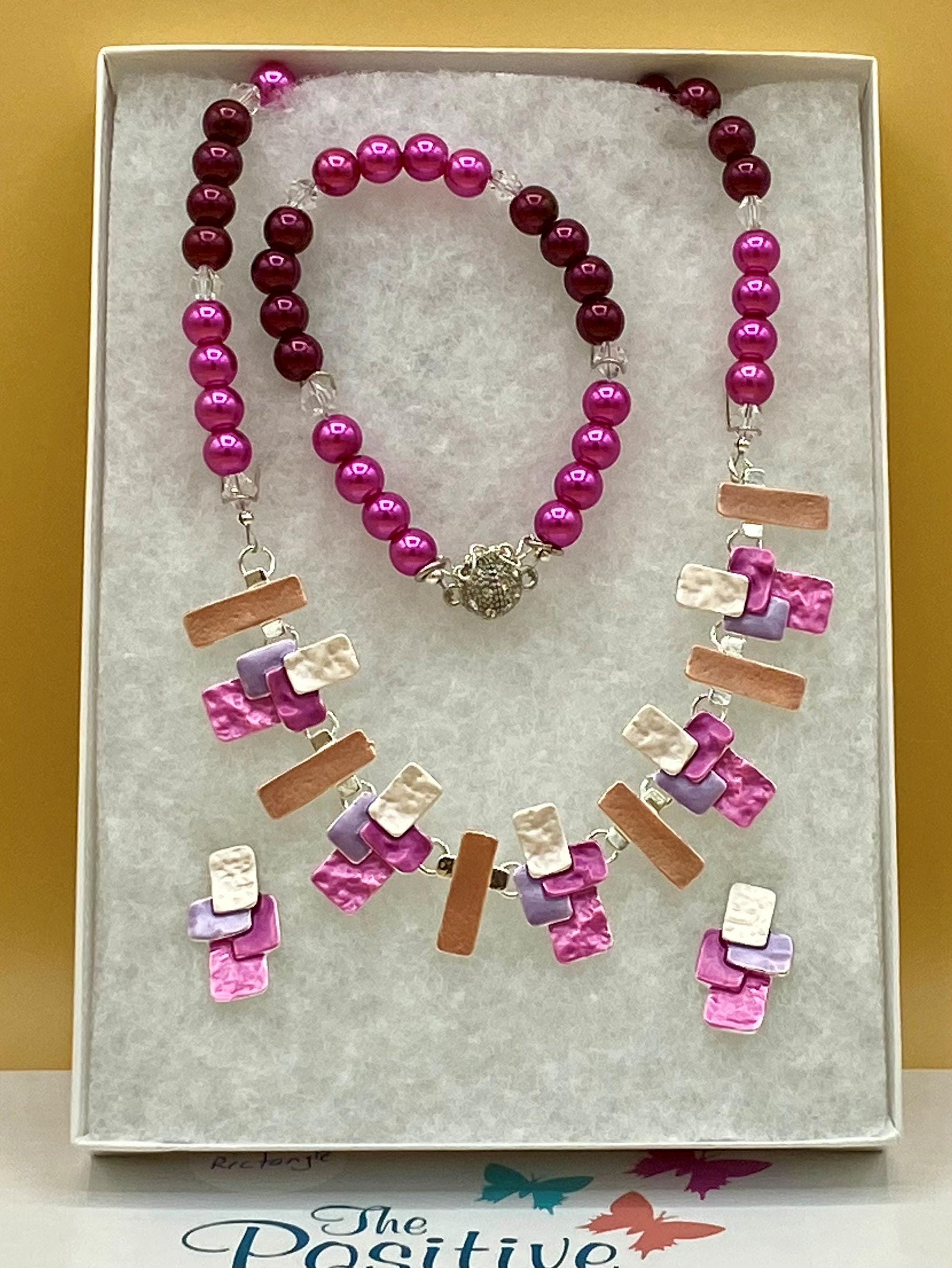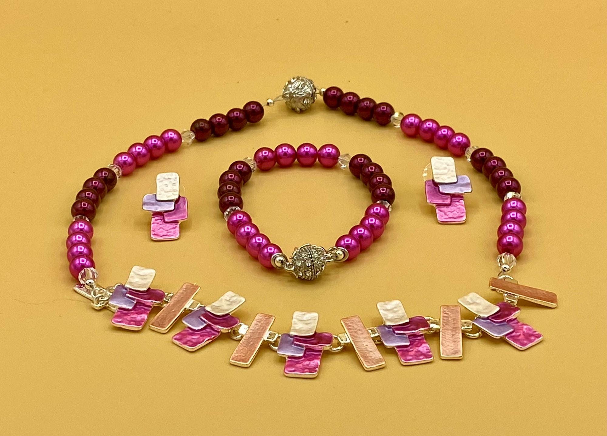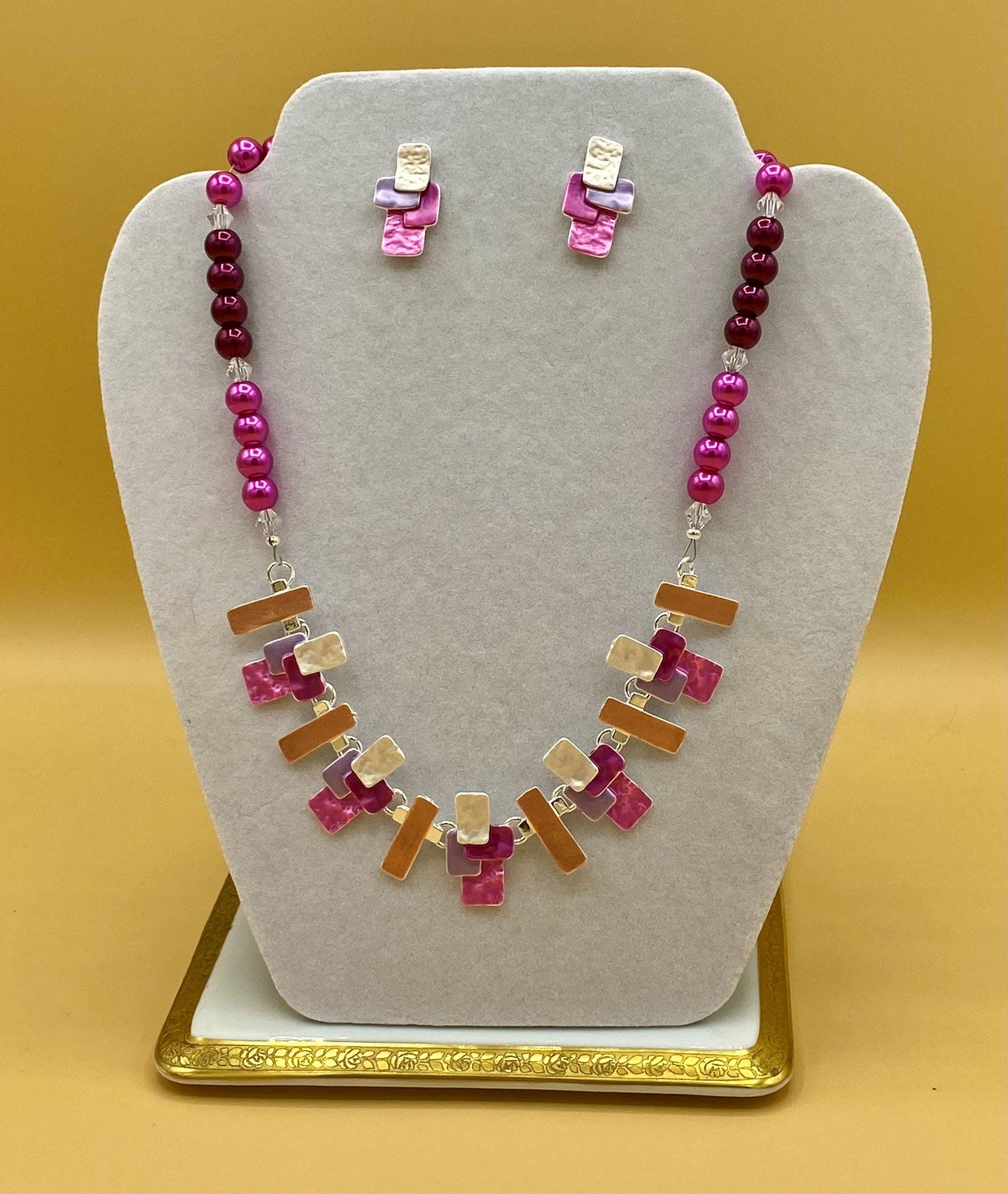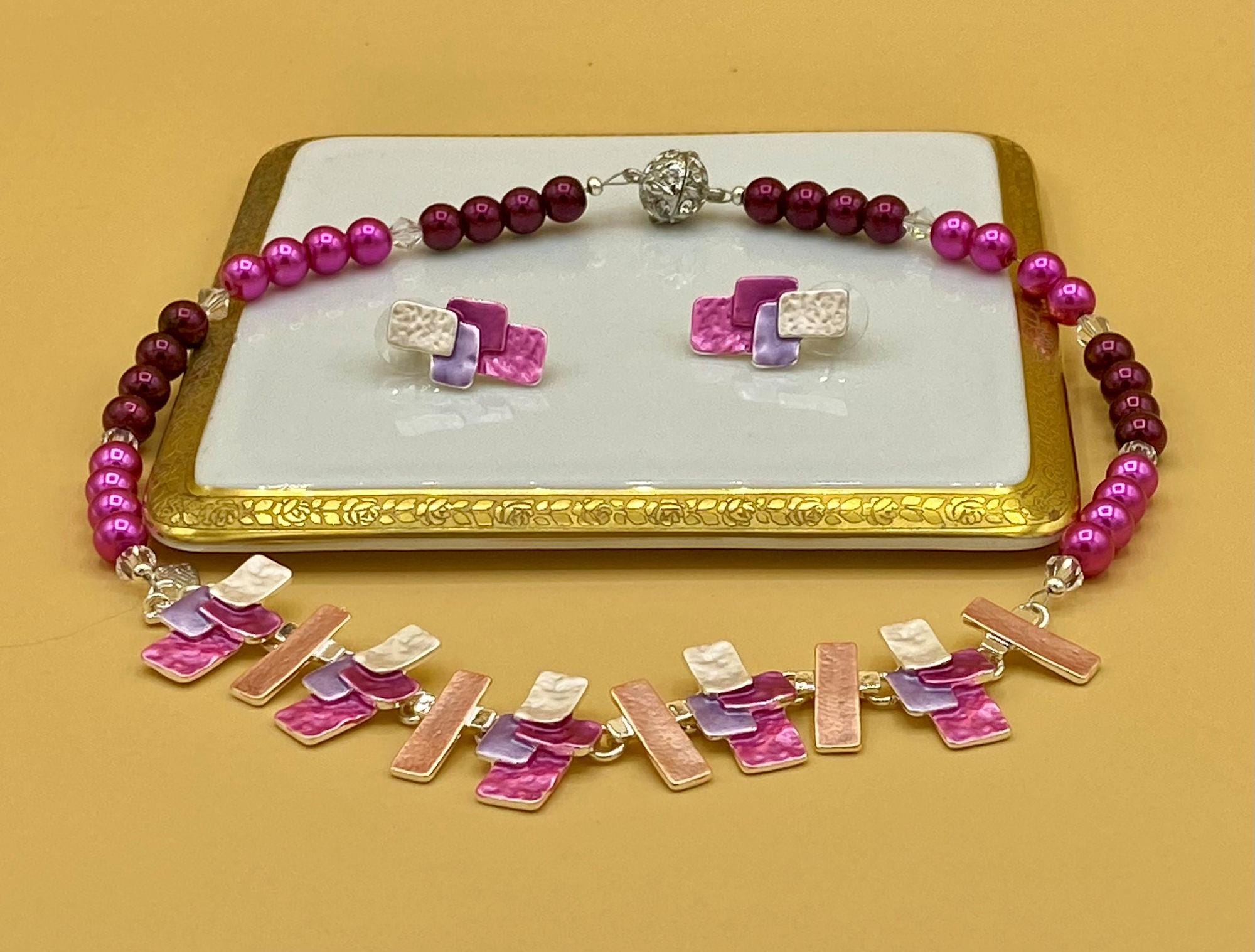Bib necklace and earring set featuring shades of pink rectangles and a magnetic closure. Each piece has a custom length to fit all sizes. Necklace is made from glass pearls and crystals to form a unique and stylish look. Matching bracelet comes with an easy to use magnetic clasp with a safety clasp to prevent loss. I can convert any of the earrings from pierced to clip on style at no charge, please request this in notes with purchase. Please do not hesitate to contact me with any questions, I would love to hear from you.