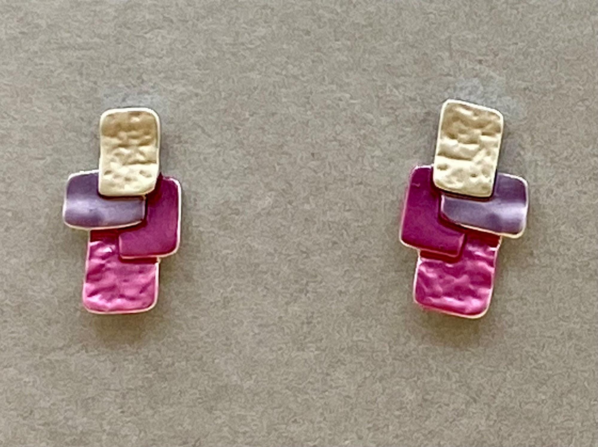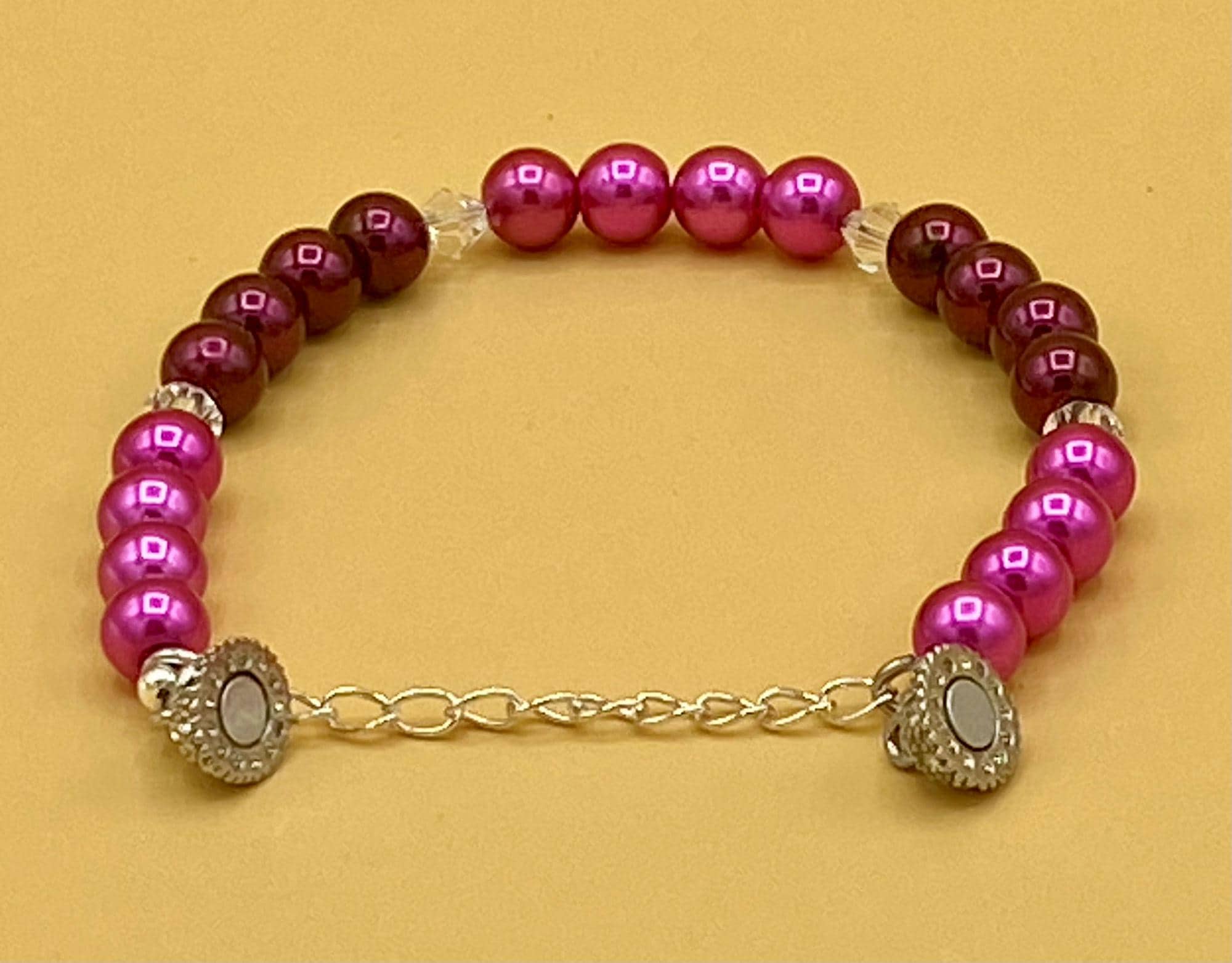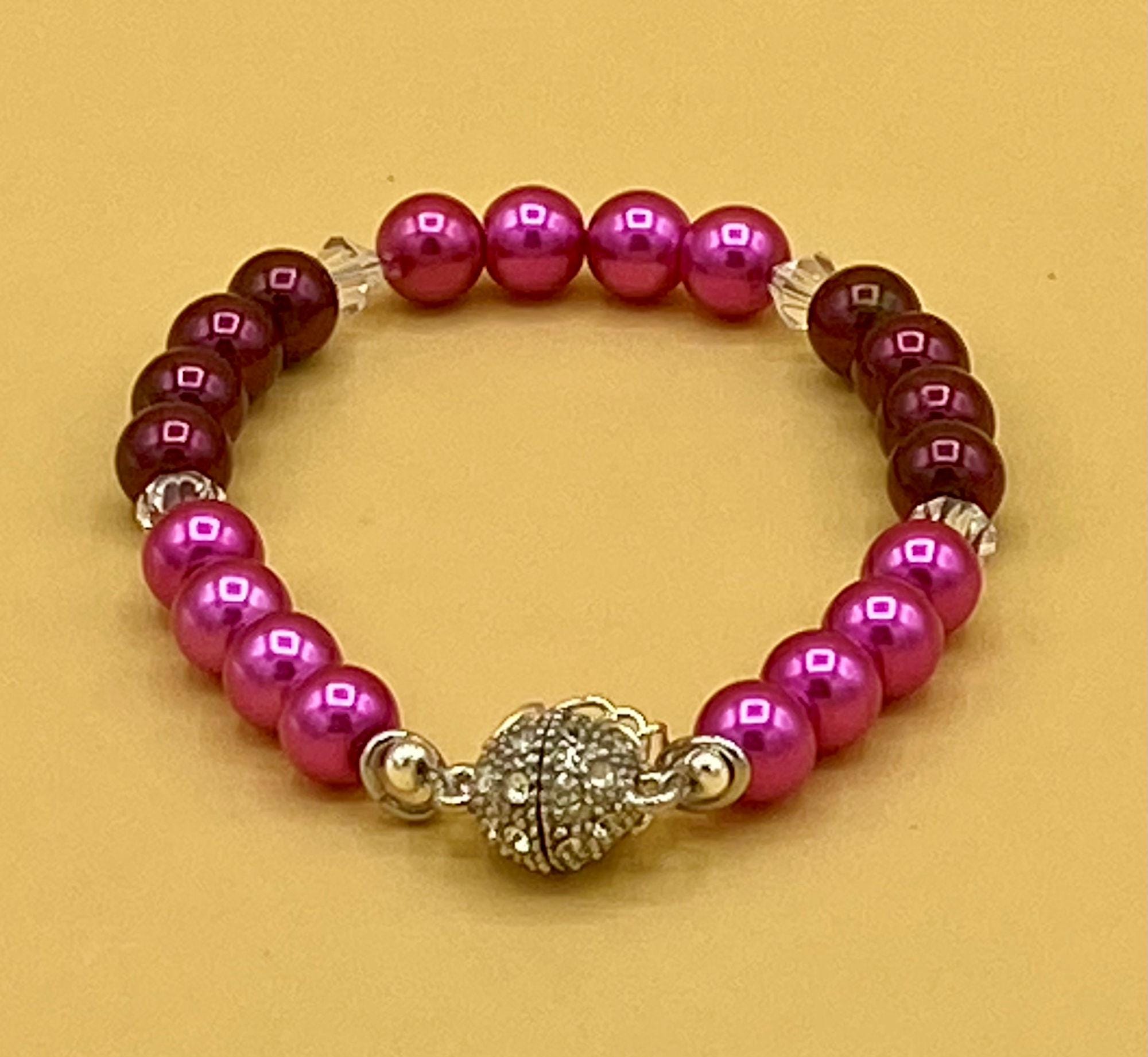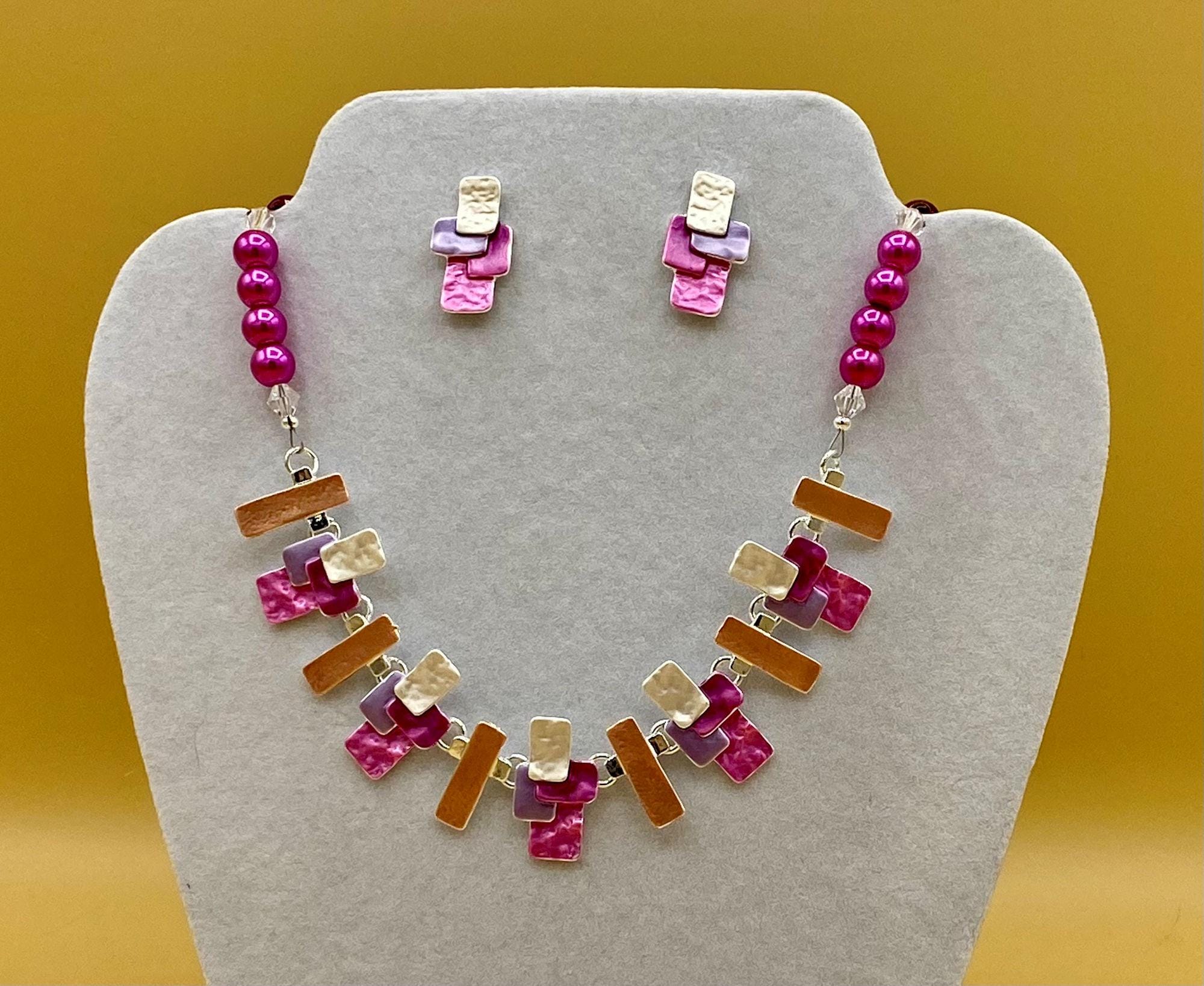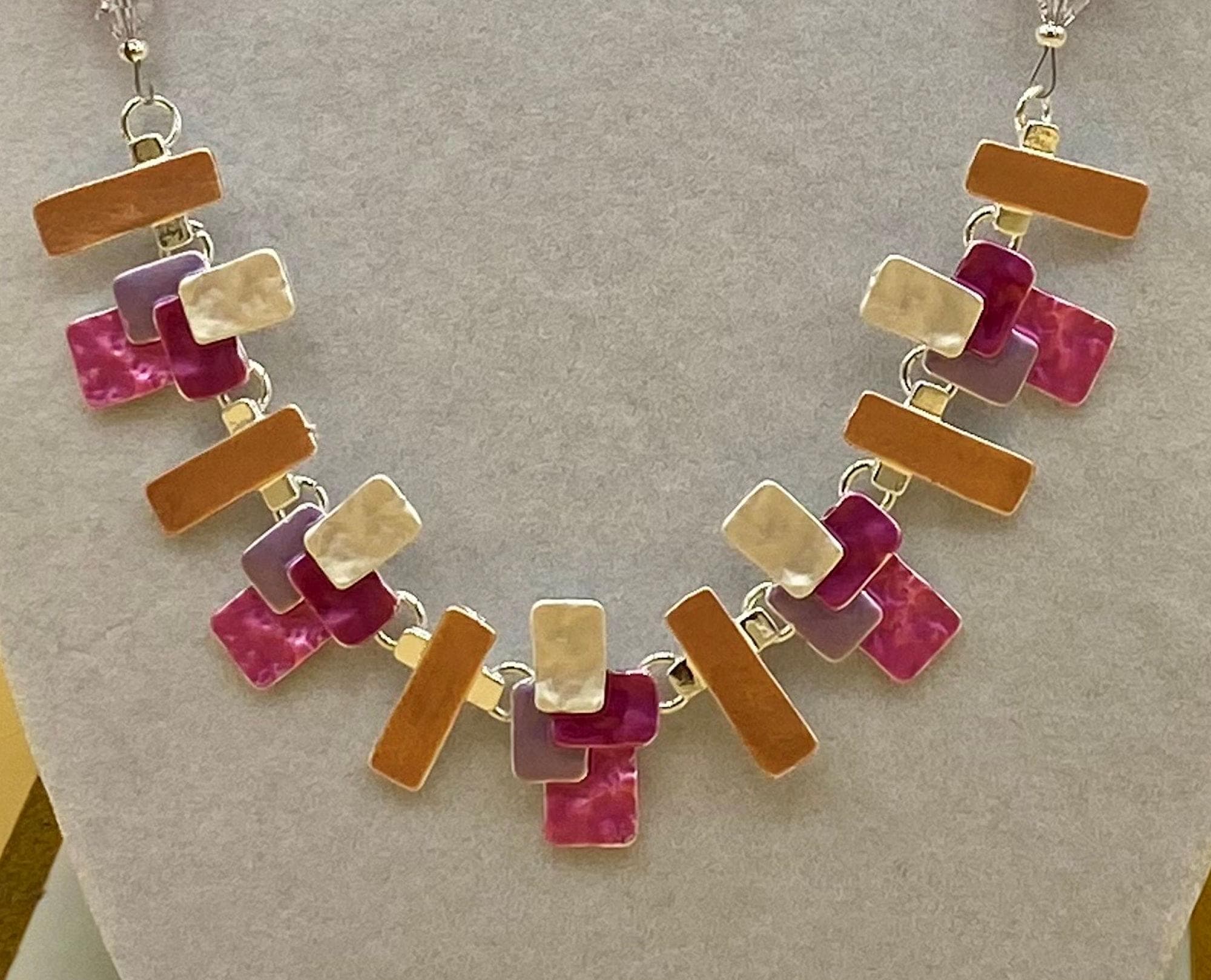 Bib necklace and earring set featuring shades of pink rectangles and a magnetic closure. Each piece has a custom length to fit all sizes. Necklace is made from glass pearls and crystals to form a unique and stylish look. Matching bracelet comes with an easy to use magnetic clasp with a safety clasp to prevent loss. I can convert any of the earrings from pierced to clip on style at no charge, please request this in notes with purchase. Please do not hesitate to contact me with any questions, I would love to hear from you.